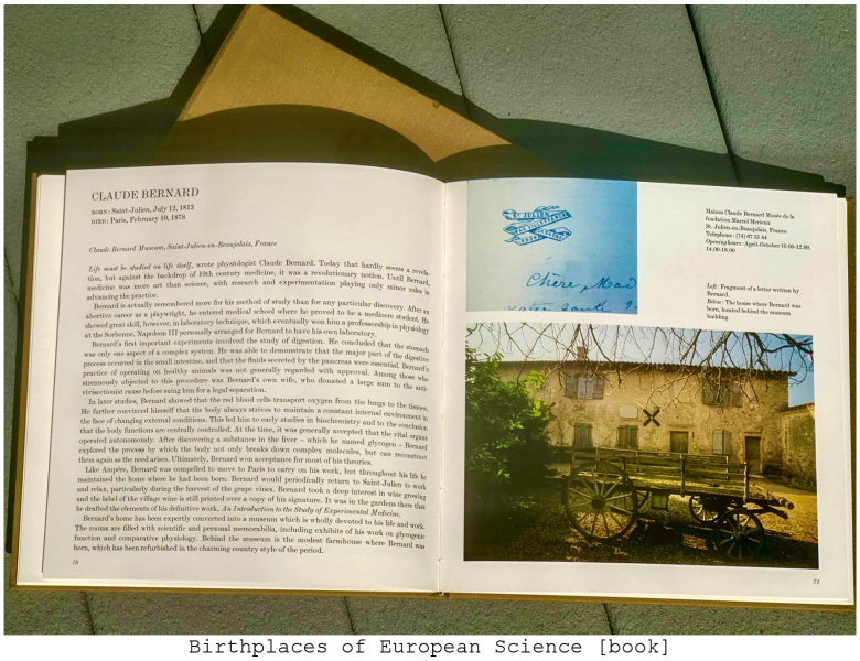 I have this fancy old volume, Birthplaces of European Science. It offers all the greats whose names we honor, from Leonardo to Einstein. But here is one whom I do not know: Claude Bernard, born in 1813. He’s sandwiched between Faraday and Darwin. Who on Earth was Bernard?